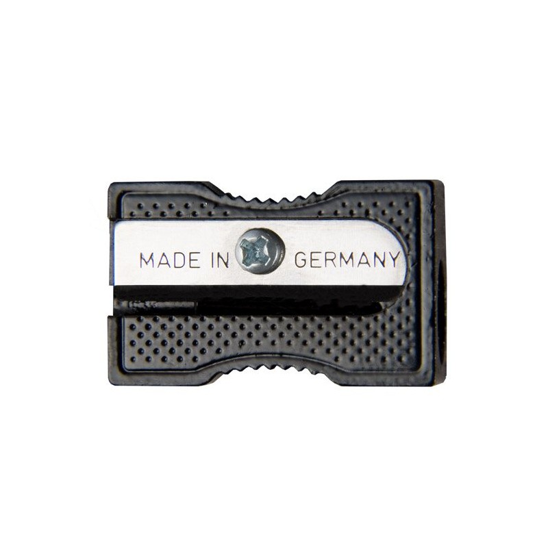 SACAPUNTAS METALICO, SENCILLO, CUCHILLA ALEMANA, ELEGANTE COLOR NEGRO METALIZADO, IDEAL PARA LAPICES DE COLOR Y GRAFITO, FORMA DE HACHA